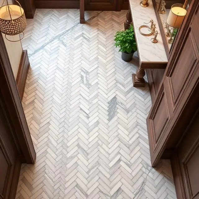 The herringbone pattern is a chameleon design. It is rooted in the ancient Roman opus spicatum used for roadway durability. It has evolved into the pinnacle of interior luxury. When paired with the natural veins of marble, it creates a floor that is both an architectural statement and a timeless piece of art.