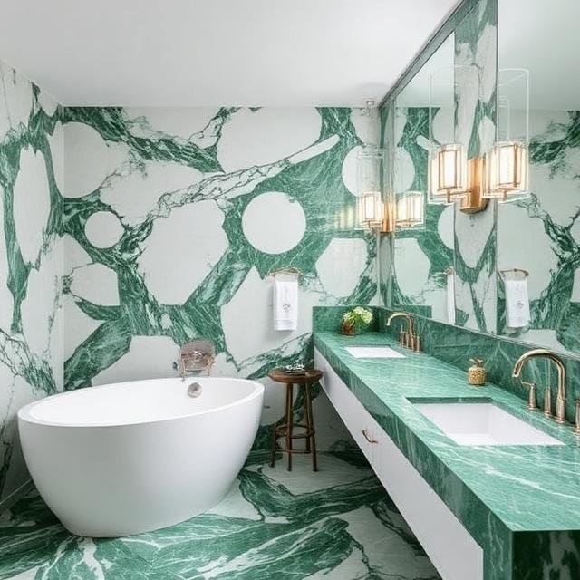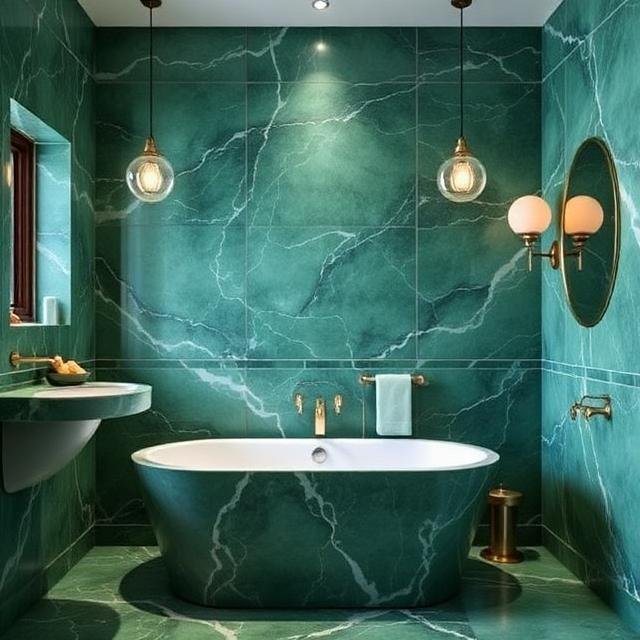 - The Setup: Lean into the drama. Instead of contrasting with white, complement your chosen marble with other deep, rich tones. Pair Verde Guatemala with dark-stained walnut vanities and deep navy-blue wall paint.