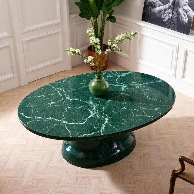 - Green Tinos Sculptural Oval: Forest green marble saal ka cool design hai. Ek oval shape wala bade table living room mein ek luxury create kartha hai.