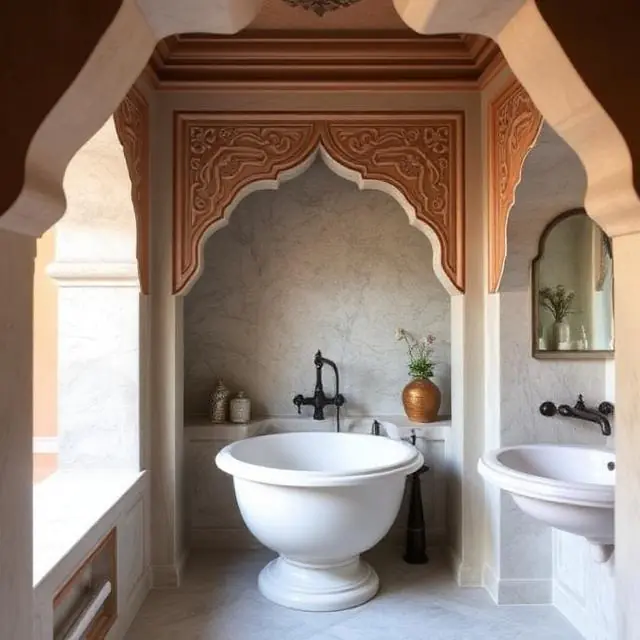 - The Chhatri Motif: Arched alcoves for soaps and shampoos can mimic the chhatri architecture.